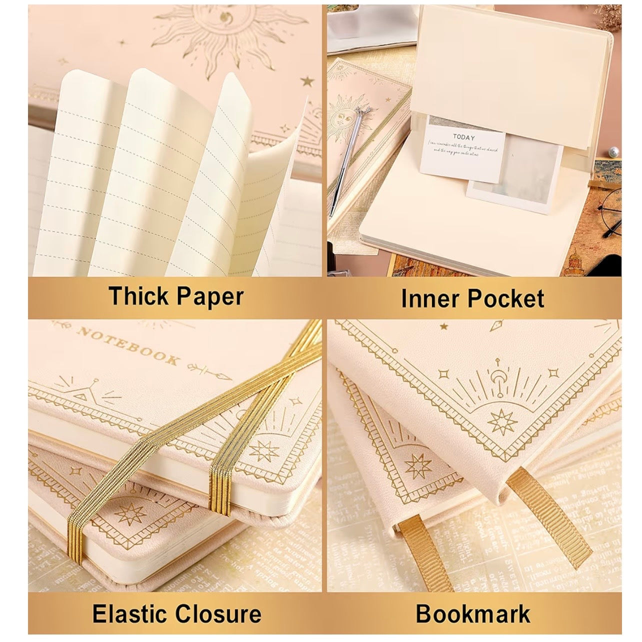 A stylish A5 notebook with a premium faux-leather cover and gold-foil sun design.